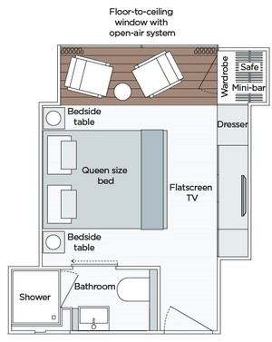 These chic suites are perfect for viewing the scenery pass by. Our innovative all-weather balcony system allows the floor-to-ceiling window to drop down electronically and an indoor decked area allows you to enjoy the sights in all their glory.