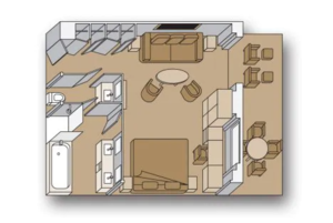 Generously proportioned and filled with light, these elegant suites include a living room, dining room, pantry with microwave and refrigerator, and floor-to-ceiling windows overlooking a private verandah with whirlpool. The bedroom features a king-size bed—our Signature Mariner's Dream™ bed with plush Euro-Top mattresses, plus a separate dressing room and the bath includes an oversize whirlpool bath and shower as well as an additional shower stall. There's also a sofa bed, suitable for two people, and a guest toilet. Amenities include a private stereo system, use of the exclusive Neptune Lounge, private concierge and an array of complimentary services.