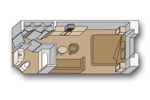 Filled with light from floor-to-ceiling windows overlooking a private verandah, these staterooms include a sitting area, two lower beds convertible to one queen-size bed—our signature Mariner's Dream™ bed with plush Euro-Top mattresses, and bath tub with premium massage shower heads.