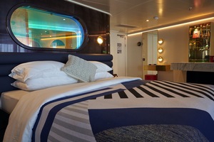 Complemented perfectly by brass nautical finishings throughout, there’s also a fully stocked, in-room bar, an indoor Peek-a-Boo shower with an iridescent dichroic glass window for a peek into the room and an outdoor Peek-a-View shower facing the sea, near the terrace Champagne table∘ and sun lounger. Sleeps up to four.