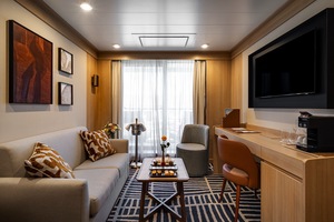 Step into a stylish and bright open living area with a spacious adjacent bedroom. This 353-square-foot suite welcomes you with spectacular views, courtesy of the sliding glass doors that lead out to your private balcony. The outdoor space adds another 110 square feet, enough to sit outside comfortably and enjoy the breeze. The bedroom features an inviting queen bed that can be converted into two twins if desired, while the bathroom includes a luxurious walk-in mosaic glass shower with rain head and body jets.