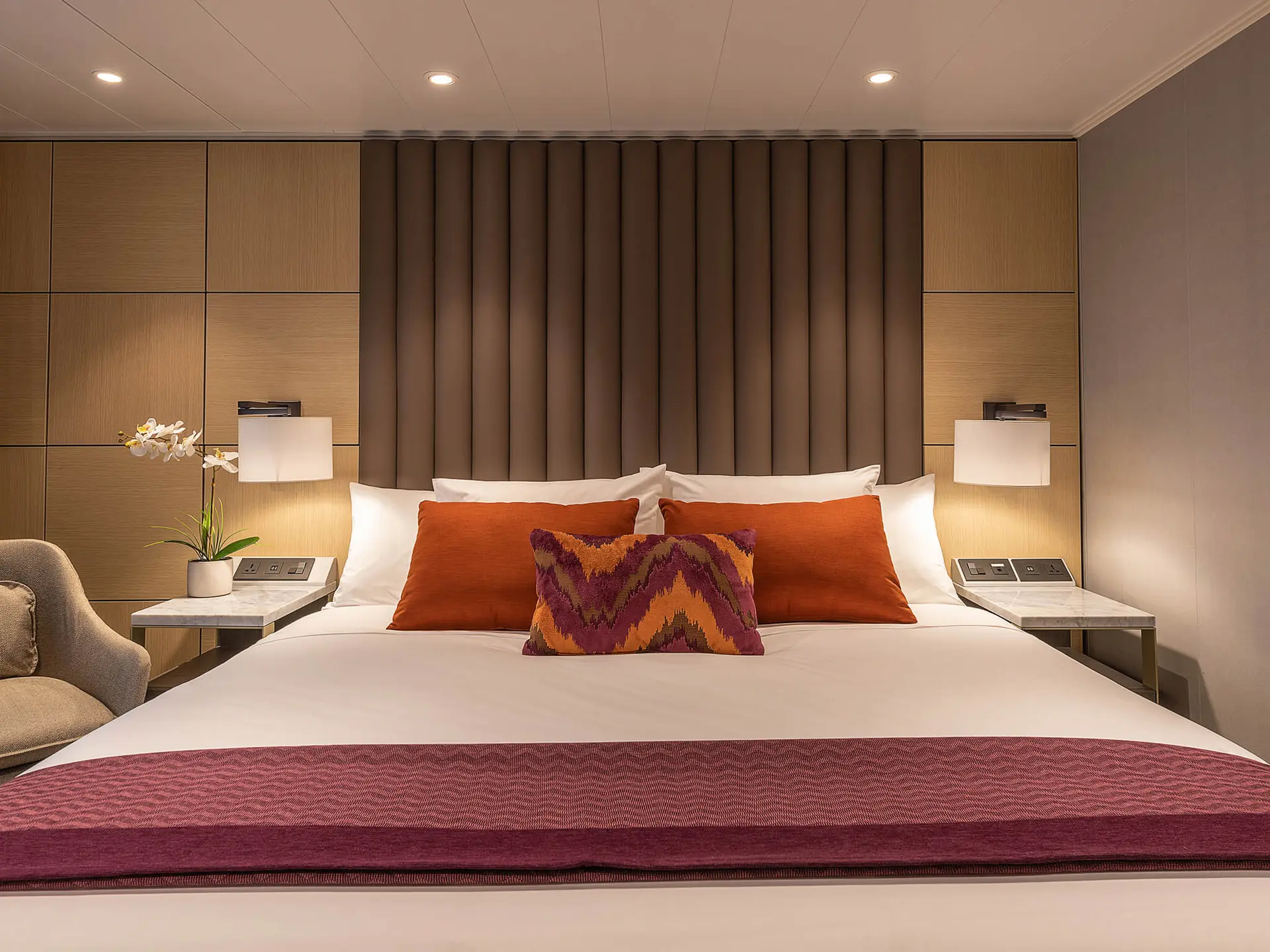 Embrace sophistication and serenity with two private French balconies and a spacious living/dining area. Located on Deck 6 for easy access and peaceful relaxation, with plush bedding and a rain shower for added comfort.